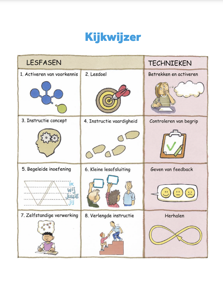 Wij geven kwalitatief hoogwaardige lessen. De leraar speelt een centrale rol bij het begeleiden van de leerlingen. Door een goede instructie waarbij de concepten en de vaardigheden in de leerdoelen expliciet onderwezen worden, leren leerlingen beter en sneller. Wij hanteren daarom voor onze lessen het Expliciete Directe Instructie model. We laten ons hierbij inspireren door het boek van Marcel Schmeier (2009) Expliciete Directe Instructie: tips en technieken voor een goede les.